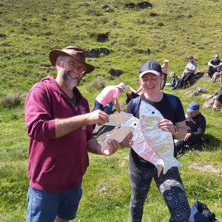 The Cadger’s Pad is a green path on a green mountainside and very difficult to film, hence the call out to local people to climb in a line along the route so that the drone could see where the trail went. This was a very odd conga party line! The silver foil fish were carried to represent the 13kg of herring that the herring girls (cadgers) of Omeath carried in creels on their backs as they walked 10 miles to the Dundalk markets. The reflective fish were also designed to show up well on the drone footage. When the walkers arrived at the top, we stopped to play music, sing and dance at the Devil’s stone – a flat rock where the girls traditionally rested to play cards, until one day, the Devil appeared to them and forbade them from gambling there. Stories were told, music echoed the hills, little girls danced, and friendships were rekindled after long Covid-enforced separations.