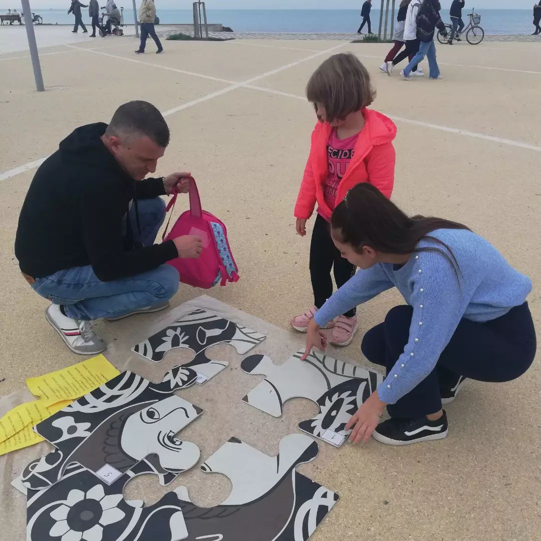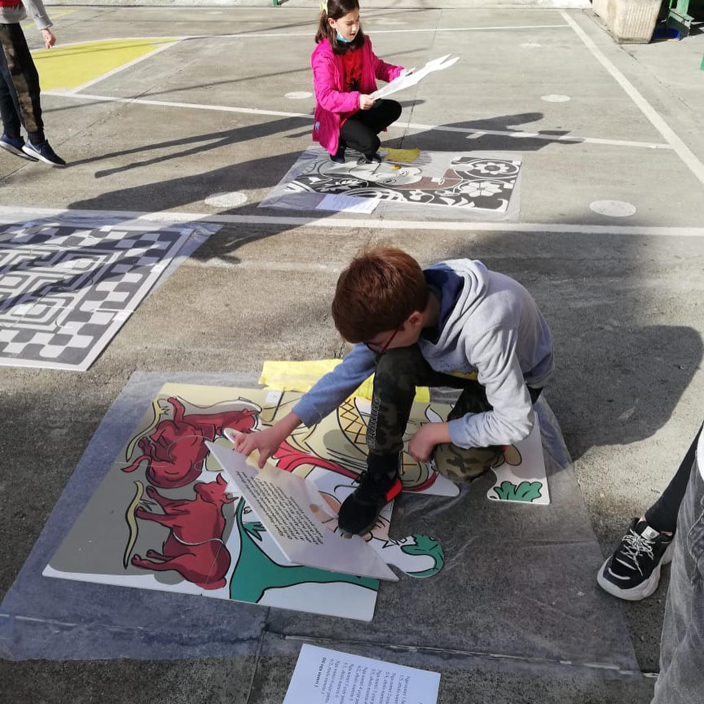 The movable carpet playground game is conceived as a movable puzzle so the activity can be enjoyed in different places. The activity uses several methodologies for achieving appreciation of the historical and decorative significance of these ancient mosaics. We also want for adults to rediscover their connection and emotions with their childhood when games were a major healthy activity of everyday life. The game is mentored and people are guided through it with particular information after each puzzle; historical evidence presented in an interpretive way (period, style, colors, symbols, quizzes, and with place orientation coordinates). This entertainment and engagement outside the home and without technology inspires children to delve into history and enjoy a cultural discovery.