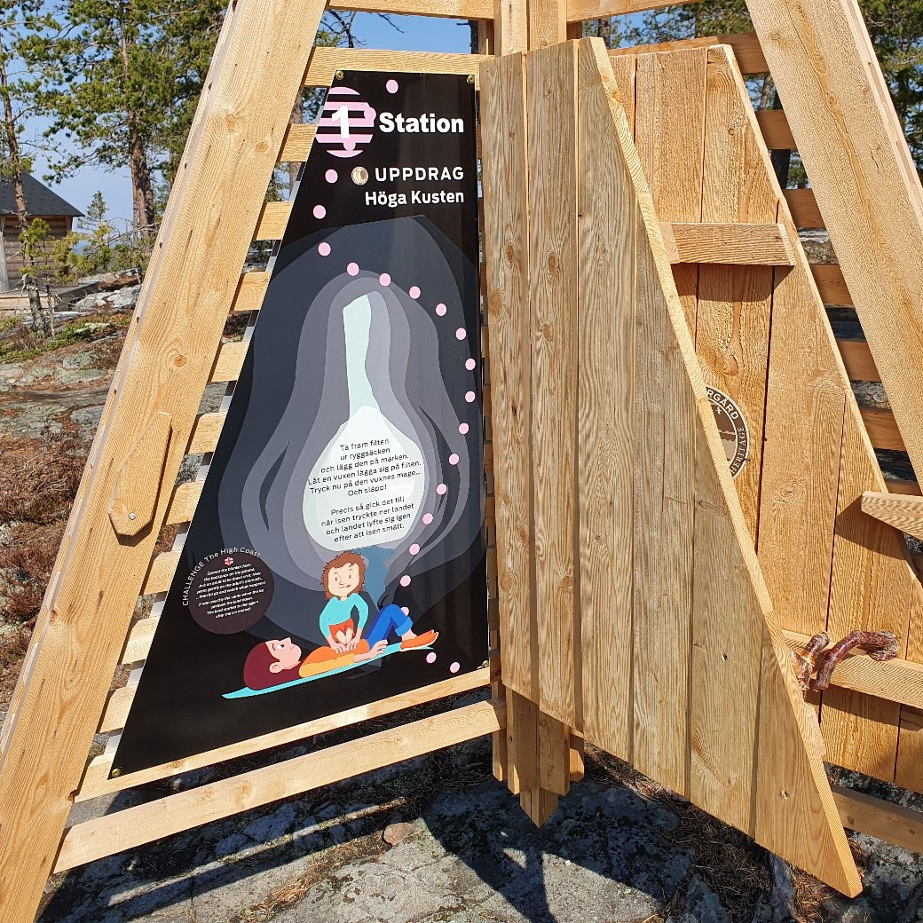 You start by borrowing a rucksack at the hotel nearby with some things you will need along the path. There are five stops with information panels. Every stop gives you first some background and then asks you to toss a coin to select one of two tasks. The tasks are about either the High Coast or the Kvarken archipelago.