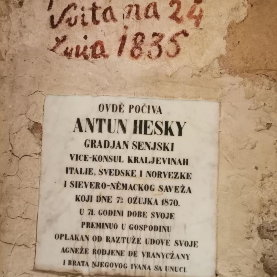Numerous citizens and dignitaries of Senj are buried in the catacombs of Senj, and details of their lives can be gleaned by studying the inscriptions on the gravestones. Some of the names of the buried include: Ivan pl. Vranicani (Dobrinović), 1866; Antun Hesky, a citizen of Senj, vice-consul of the Kingdom of Italy, Sweden, and Norway and the North German Confederation; Josip Giurković, doctor of wisdom, lawyer, 1850; Katarina Domazetovich, Amalia Gjurković, born pl. Turkail, 1862; Magdalena de Wukasovich, 1835; Julie Thinelli von Loewenstern born von Lang Magistratis Gattin, 1848; Our Lady Captain Domazetovich, 1840.