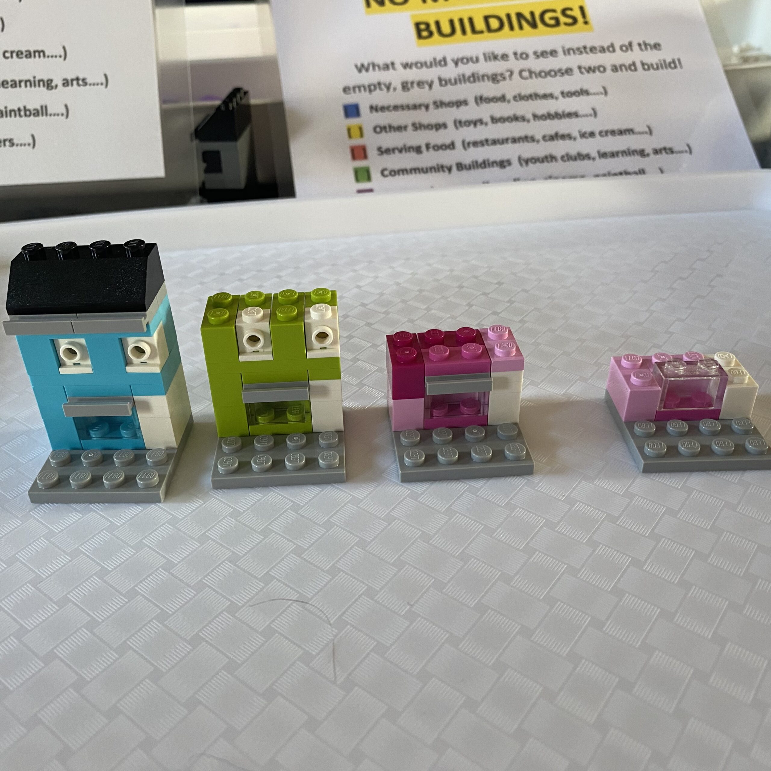 People were invited by play workers to respond to the blacked-out buildings by creating different coloured mini models for their top two choices selected from a range, including necessary shops (food, clothes, and tools), community buildings (youth clubs, learning, arts), and homes (houses, apartments, and shelters) etc. And again, the models were displayed as a visible record of the people’s vote.