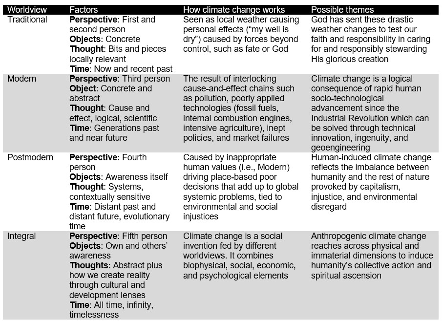 The table shows how worldviews construct climate change. Remember as we move up, people see more of the hyperobject and can contemplate facets that previous worldviews don’t even know exist.